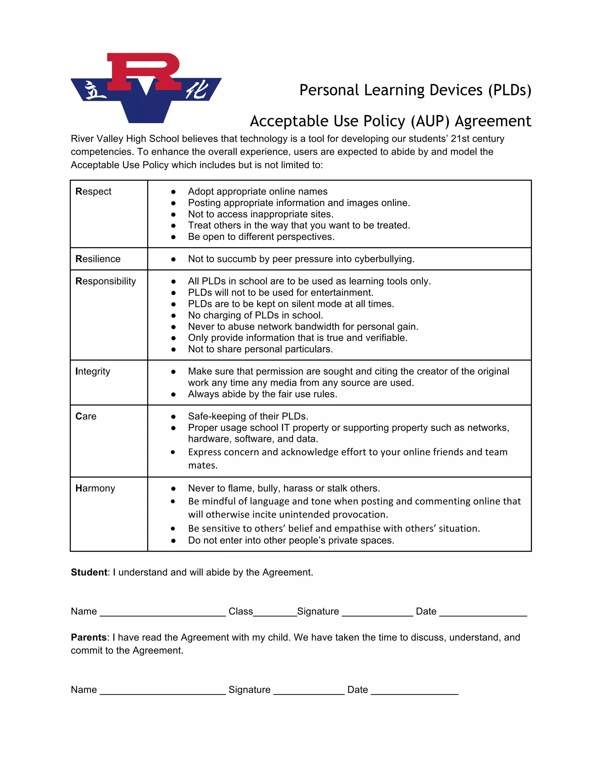 River Valley High School believes technology should develop 21st century skills. The Acceptable Use Policy agreement for Personal Learning Devices outlines expectations for appropriate and responsible online behavior. This includes showing respect for others, not cyberbullying, using devices only for learning, maintaining privacy and integrity, and caring for school technology resources. Students and parents must sign agreeing to abide by the policy, which also establishes guidelines for appropriate device use at home, including setting limits for activities, locations, screen time, and maintaining open communication.