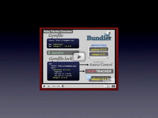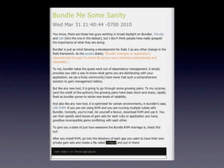 RVM allows installing and managing multiple Ruby environments and gemsets. The author had a mismatch between their Ruby and Rails versions that caused issues. They installed RVM and used it to install Ruby 1.8.6 and keep gems separate for different projects. Bundler works with RVM to specify gems in a Gemfile and ensure consistent dependencies. Creating an .rvmrc file sets the Ruby version and gemset for a project directory.