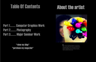 3) Major seminar pieces using materials like sharpies, duct tape, and tape to create abstract puzzling images connected as a series exploring themes of opposites. The pieces are meant to make the viewer question the images and move their eyes throughout.