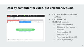 This document provides an overview of a virtual training on network building. It includes instructions for joining the audio portion of the meeting by phone. The agenda covers an introduction to networks and their benefits, an exercise on how networks could benefit work on health equity, principles of network culture, and an exercise assessing network behaviors. Participants discuss how networks could expand their collaboration and connect them to new resources and people working on related issues. They also consider network behaviors they could adopt to strengthen values like transparency, shared power, and self-organization.