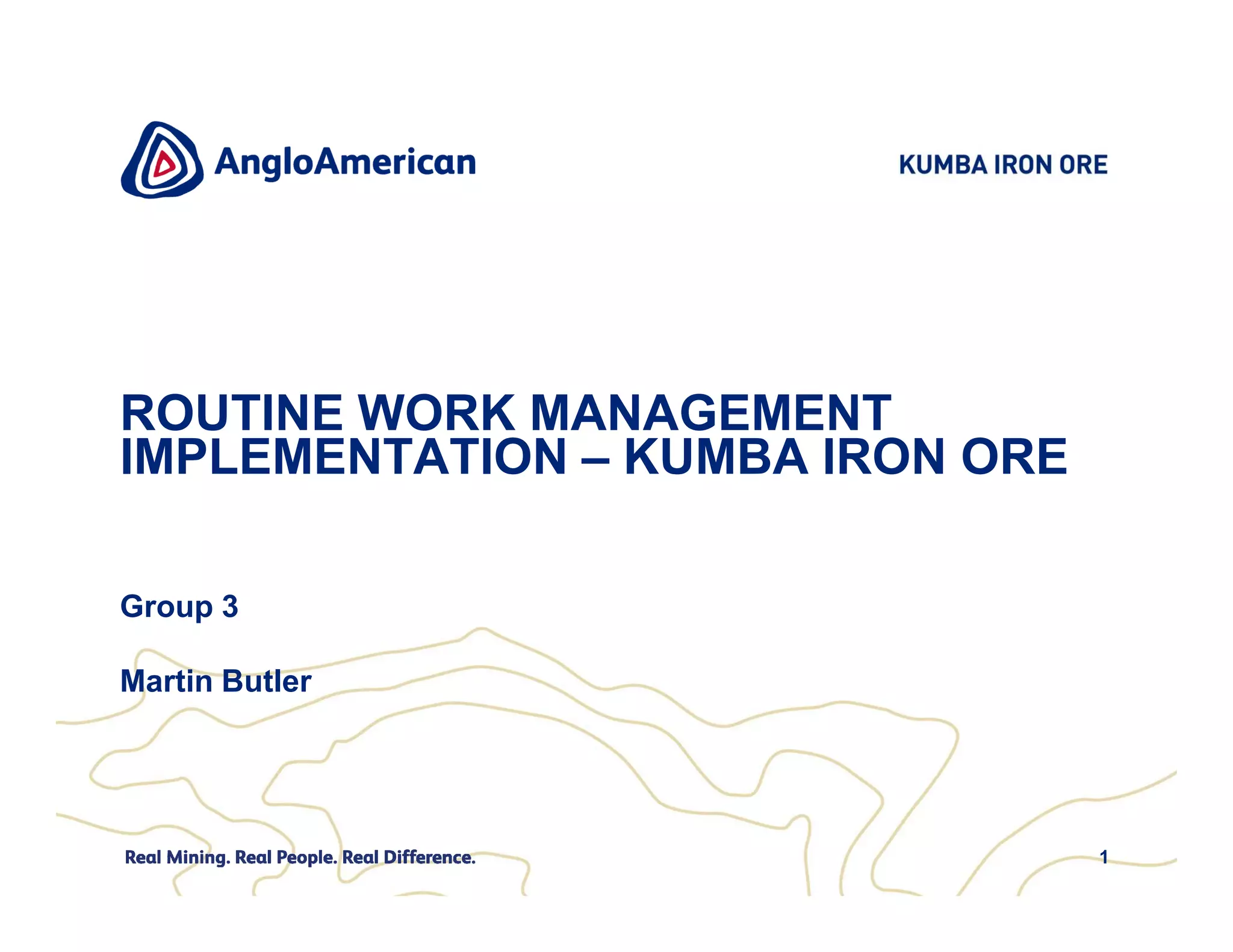 Martin Butler presented a solution to improve routine work management (RWM) at Kumba Iron Ore. The current SAP PM module was ineffective for planning and scheduling tasks or allocating resources. The solution was to develop an add-on system to calculate available man-hours and allocate resources to scheduled tasks. This would provide visibility into resource utilization and allow for optimal allocation. However, future upgrades may not include the add-on and it cannot integrate with other SAP functions for reporting. Considerations for future projects include involving ERP specialists, ensuring upgrades and a BI system for accurate reporting.