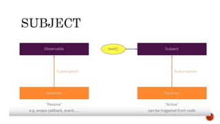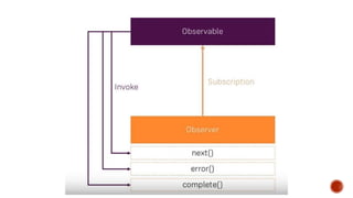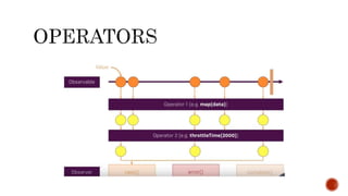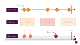 The document discusses the reactive programming paradigm that responds to various stimuli, emphasizing its application in handling asynchronous data streams from multiple sources. It introduces observables as a key component for managing these streams and lists several programming languages that support reactive extensions (Rx) such as Java, JavaScript, C#, and Python. The content highlights the utility of observables for filtering, transforming, and composing data while noting the learning curve associated with the extensive Rx API.