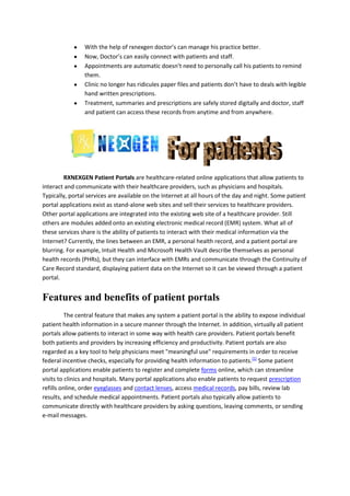 RXNEXGEN is doctor practice management software that allows doctors to schedule appointments, access patient health records, generate bills and prescriptions, and access analytics from anywhere via secure cloud servers. The software automates daily tasks like appointment reminders and stores records digitally, improving efficiency. Patient portals connected to the software allow secure access to health information and communication with doctors online.