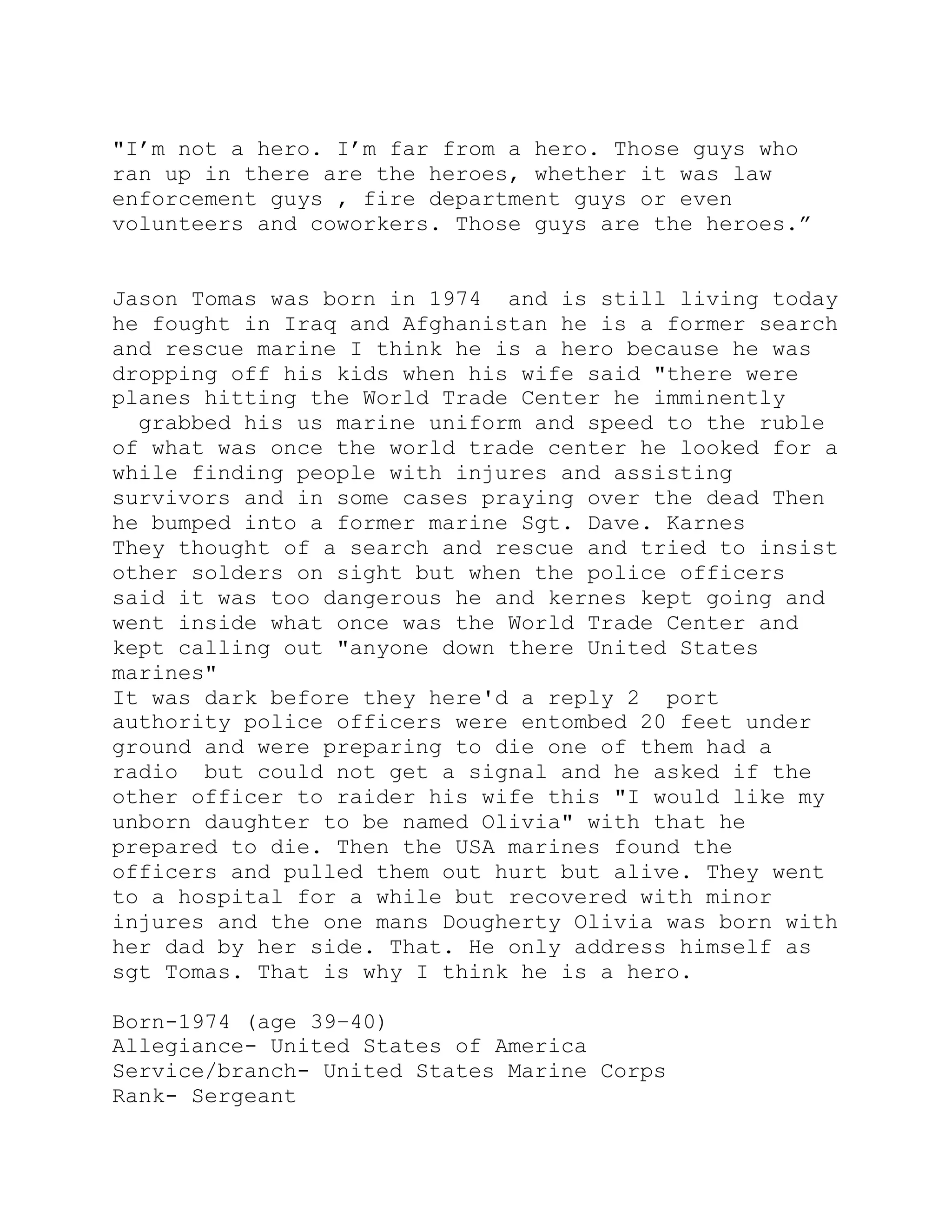 Jason Tomas, a former US Marine sergeant born in 1974, responded immediately after the 9/11 attacks by putting on his uniform and going to the rubble of the World Trade Center to help with search and rescue efforts. Along with another former Marine, Dave Karnes, he went into the collapsed building despite it being deemed too dangerous, calling out for anyone trapped below. They found two Port Authority police officers trapped 20 feet underground who were preparing to die, and pulled them to safety with just minor injuries. One of the officers had asked to radio his wife to name their unborn daughter Olivia. Though Tomas said the first responders were the true heroes, his actions in running into danger to save lives exemplified hero