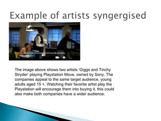 Synergy occurs when two companies cooperate to achieve better results than if they worked alone. The document provides two examples: artists Giggs and Tinchy Stryder playing the Sony PlayStation helped both companies appeal to young adults aged 15+ by encouraging fans to buy the console, potentially widening both audiences. A second example is the music group JLS synergizing with Nintendo Wii.