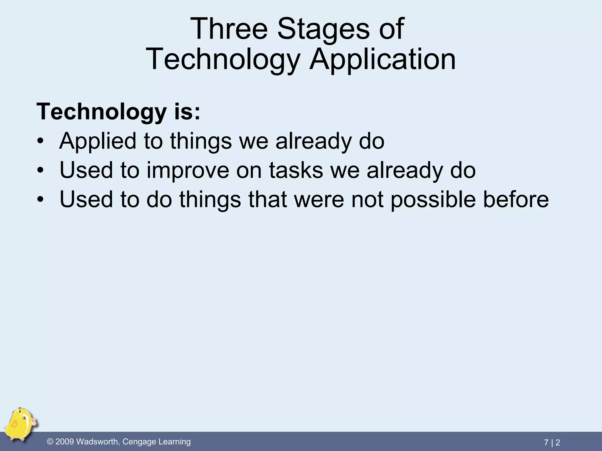 There are three stages of technology application in schools: using technology to do existing tasks, improving on existing tasks, and enabling new tasks not previously possible. Schools face pressure to integrate technology from various stakeholders. Technologies can be used as productivity tools to accomplish tasks more efficiently or as cognitive tools to enhance thinking. Technologies affect student learning in different subject areas such as providing simulations in science, tutorials and graphing in math, and communication tools in foreign language. Technologies also benefit students with special needs and allow distance learning. As technologies are integrated, teachers take on more of a facilitator role and emphasize formative assessment to confirm student understanding of concepts and tools. Key issues for schools regarding technology include infrastructure, budgets, professional development, equity, and