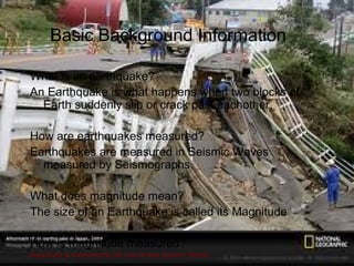 This document summarizes information about seismic waves and the 2011 Tohoku earthquake in Japan. It defines an earthquake as occurring when two blocks of earth slip past each other, and explains that they are measured by seismic waves on seismographs. It then discusses the damage caused by earthquakes through collapsing buildings and tsunamis. The document outlines the two types of seismic waves and how P and S waves travel. It also summarizes details about the 2011 Tohoku earthquake such as its magnitude of 9.0 and effects like damage to cities and the environment in Japan.