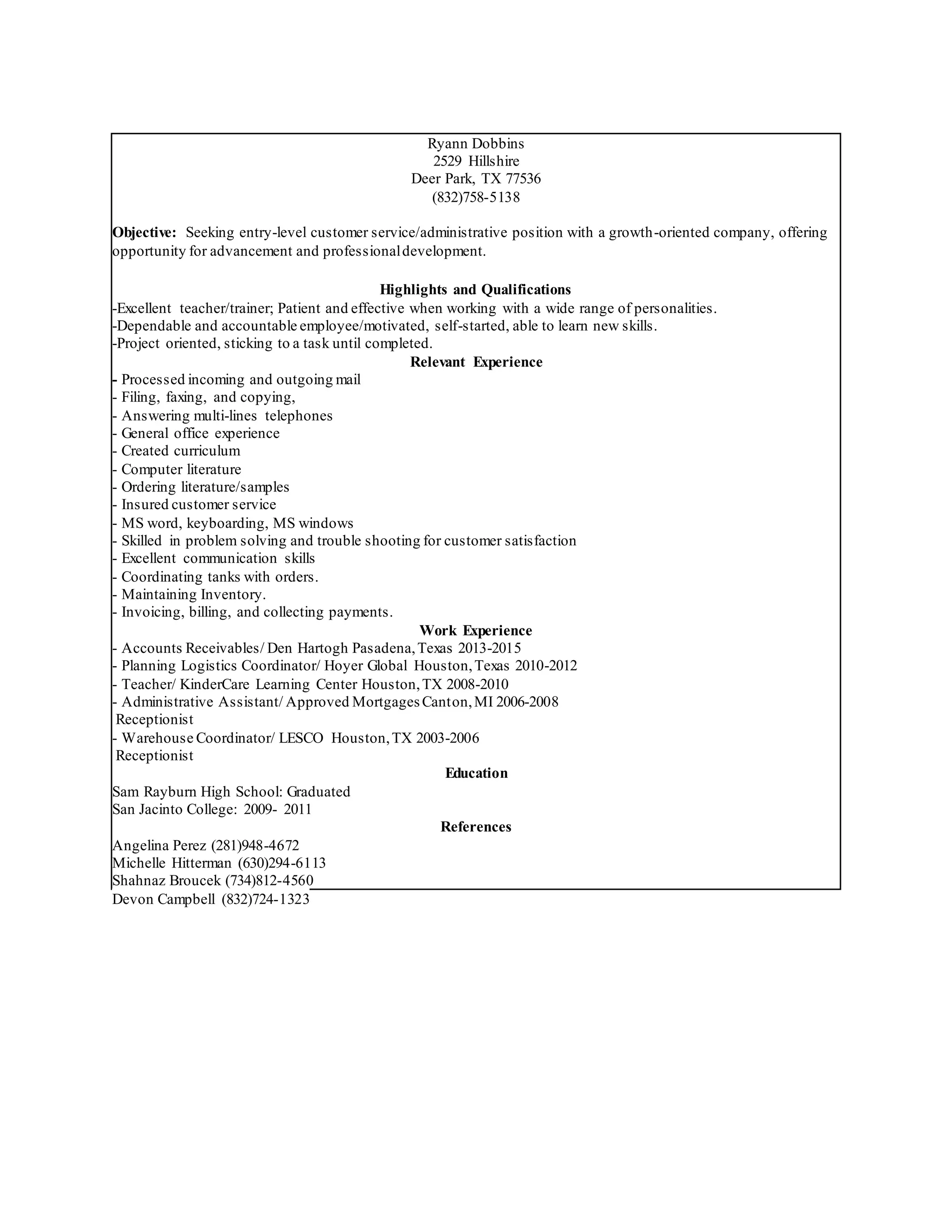 Ryann Dobbins is seeking an entry-level customer service or administrative position and has over 15 years of relevant work experience. She has excellent communication, problem-solving, and customer service skills developed through roles in accounts receivables, logistics coordination, teaching, administrative assistance, and reception. Dobbins also has experience with tasks like data entry, filing, phone answering, and inventory maintenance. She lists strong qualifications like being a patient teacher, dependable employee, and skilled problem-solver focused on completing projects.