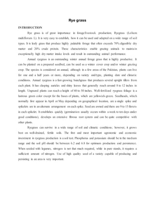 Ryegrass is an important forage crop that is highly productive and adaptable to a wide range of soil types. It produces highly nutritious foliage that enables grazing animals to maintain high intake levels and performance. Ryegrass establishes quickly, develops an extensive root system, and can compete well with other plants. It grows best in well-drained, fertile soils with a pH between 6.2-6.8. Sowing times vary by location but generally occur in spring or fall. Seedbed preparation is followed by broadcasting seed, with or without pre-soaking. The seed must maintain soil contact for establishment. Fertilizer and weed management, as well as grazing practices after establishment, are important to the