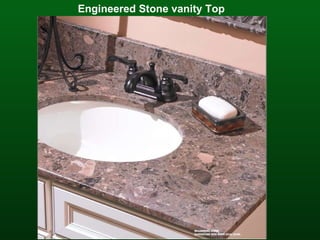 The document lists various types of vanity tops, countertops, and casegoods including engineered stone, laminate, granite, cultured marble, and solid surface materials that can be used for kitchens and bathrooms. It mentions vanity tops, laminate countertops and casework, granite and cultured marble options for both kitchens and bathrooms, and laminate and imagination series products.