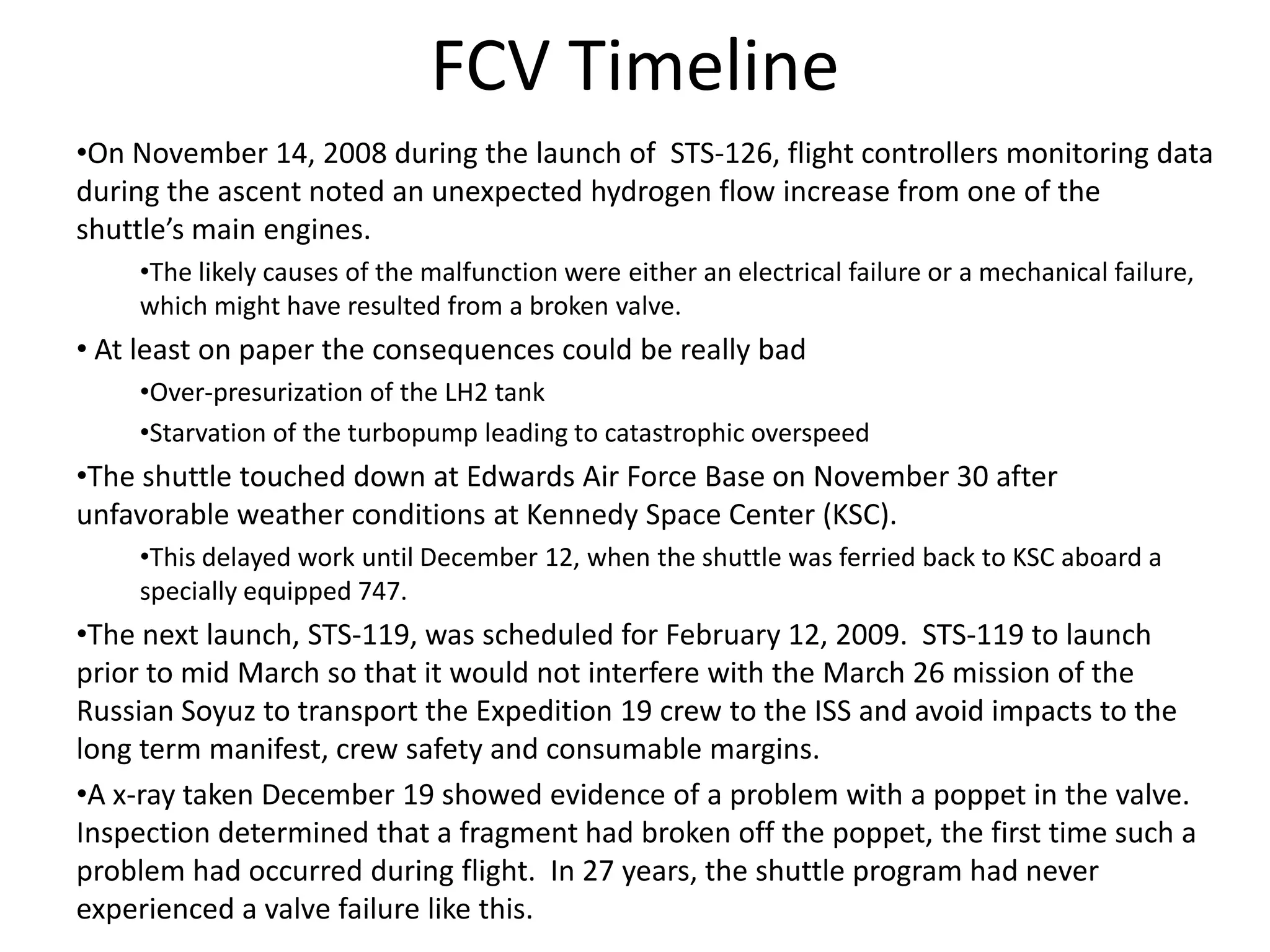 1) During a 2008 space shuttle launch, an unexpected hydrogen flow increase was detected from one of the shuttle's main engines, likely due to an electrical or mechanical failure in a valve.