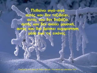 Πεθαίνει σιγά-σιγά αυτόςπου ενώ είναι δυστυχισμένος στον έρωτα ή στη δουλειά του μένει απαθής , αυτός που δεν ρισκάρει για να πραγματοποιήσει τα όνειρά του , αυτός που ούτε μια φορά στη ζωή του δ εν αγνόησε τις συνετές συμβουλές… Traduction d’un texte de Pablo Neruda Prix Nobel de Littérature 1971