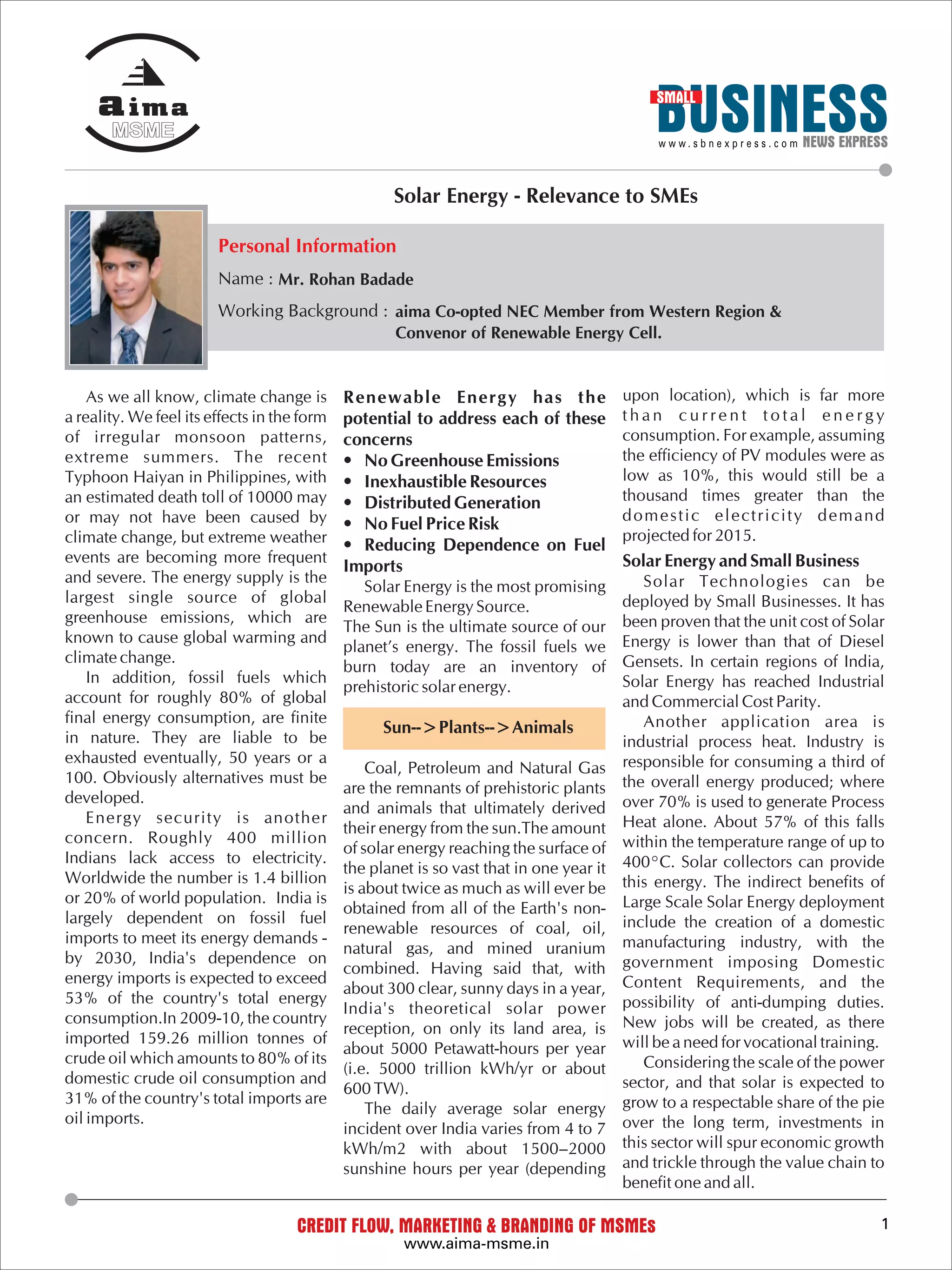 This document discusses the relevance of solar energy for small and medium enterprises (SMEs) in India. It notes that climate change is a serious problem caused by greenhouse gas emissions from fossil fuel use. Solar energy is a promising renewable alternative that can address energy security issues and reduce dependence on fossil fuel imports. India receives a large amount of solar radiation that could meet its energy needs many times over through solar power. The document argues that solar technologies are suitable for small businesses, as the costs of solar have reached parity with diesel generators in some areas of India. Solar can provide process heat for industrial applications. Widespread adoption of solar energy would create domestic manufacturing and jobs while spurring economic growth for SMEs.