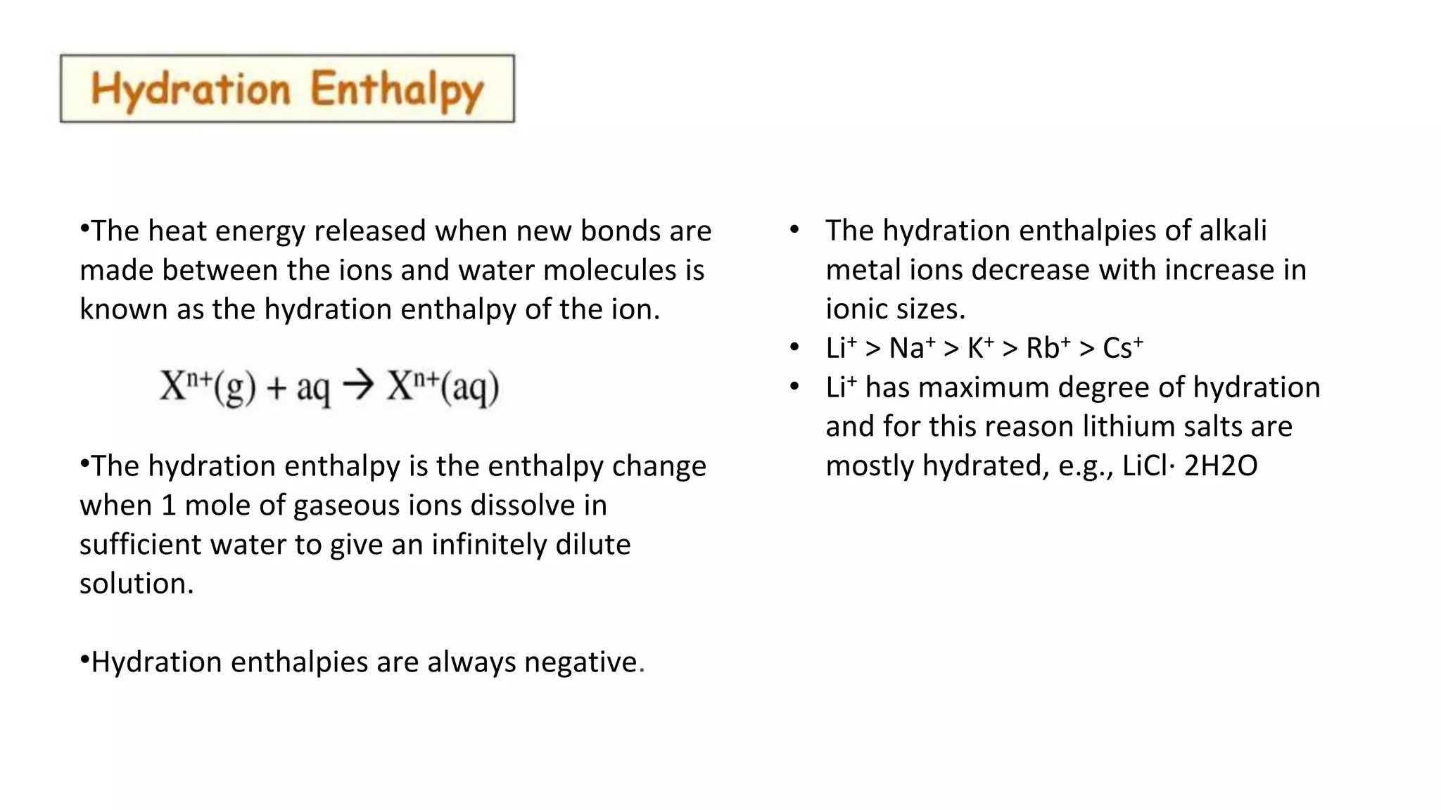 The document discusses several properties of alkali metals. It states that the hydration enthalpy of ions, which is the heat released when ions dissolve in water, is always negative and decreases with increasing ionic size from Li+ to Cs+. It also notes that density increases down the group, though K is lighter than Na. Different alkali metals and their salts impart different colors to flames due to electron excitation and emission. Detection methods include flame tests, flame photometry, and atomic absorption spectroscopy. Chemical reactivity increases down the group as ionization enthalpy decreases.