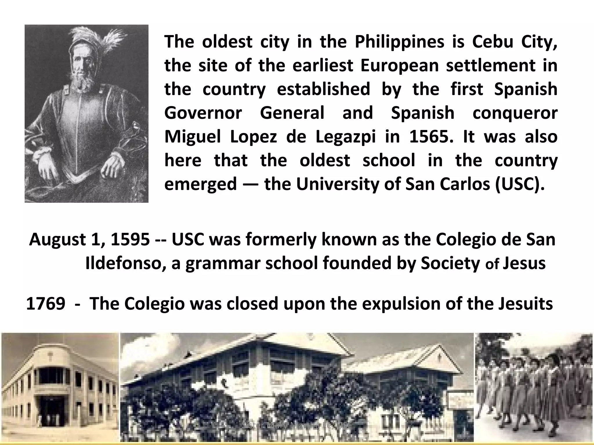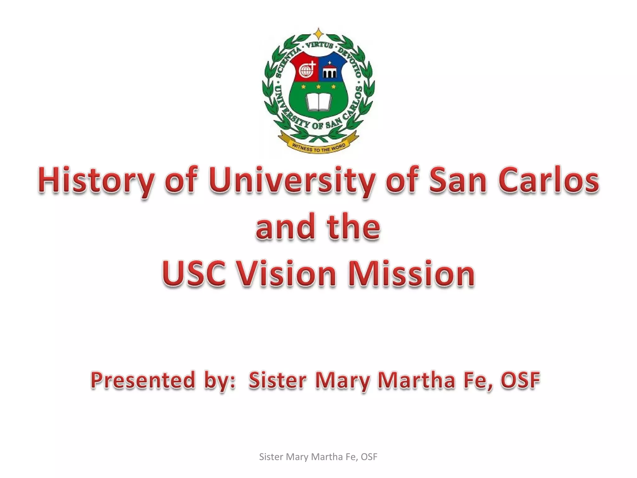 The University of San Carlos in Cebu City, Philippines traces its origins to 1595 when the Society of Jesus founded the Colegio de San Ildefonso, making it the oldest school in the country. In 1779, the school was reopened as the Seminario de San Carlos under the Diocese of Cebu. It later became known as the Colegio-Seminario de San Carlos and accepted secular students seeking advanced education in 1867. After changing hands between religious orders, the school became the University of San Carlos in 1948. Its mission is to provide relevant and transformable academic programs to serve local, national, and global communities through teaching, research, and community service.