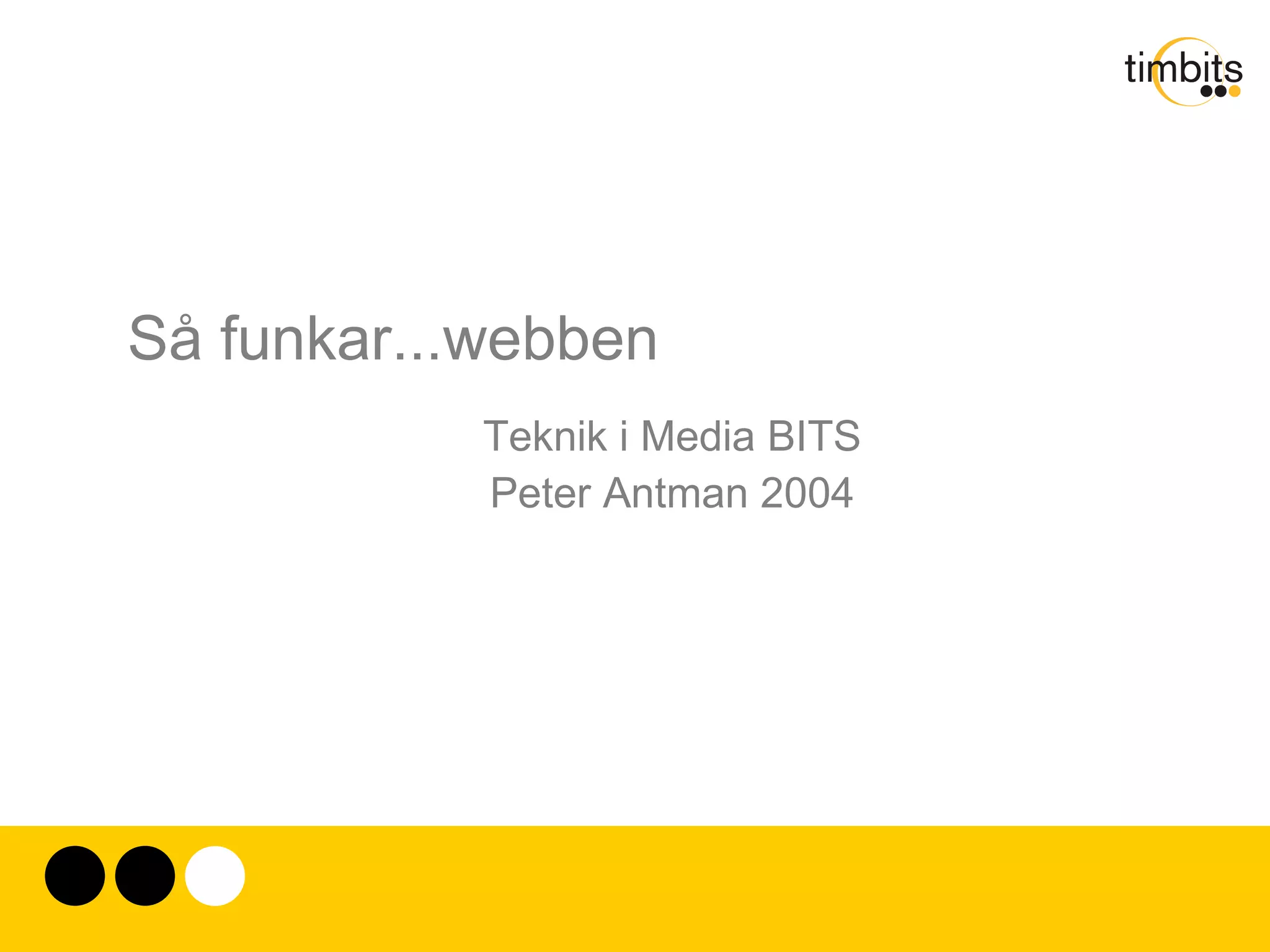 Så funkar...webben Dessatre vardagliga, enkla saker utgör de tre ben som webben står på: Adress format: URL (Uniform Resource Locator). Var finns resursen Internetprotokoll: HTTP (HyperText Transport Protocoll) Hur skall den hämtas. Dokumentformat: HTML (Hypertext Markup Language) Hur skall den visas upp