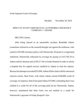 The Supreme Court of Georgia issued an order regarding the case State Farm Mutual Automobile Insurance Company v. Adams, stating that a motion for reconsideration must be filed by December 10, 2010. The ruling determined that State Farm was entitled to a credit against Adams’ uninsured motorist coverage for payments made to Grady Hospital, as the hospital's lien was considered part of Adams' economic damages and thus did not reduce the tortfeasor’s liability coverage. The court reversed the court of appeals' previous ruling that stated otherwise, clarifying the relationship between uninsured motorist benefits and hospital liens.