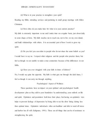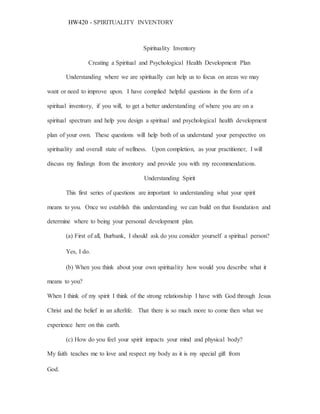 The document is a spiritual inventory completed by an individual named Burbank. It contains questions about Burbank's spirituality, beliefs, faith practices, outlook, and ego. The practitioner analyzed Burbank's responses and found he has a strong Christian faith that influences his view of spirituality. The practitioner's recommendations are for Burbank to read two books and practice daily meditation to help open his mind and grow his spiritual understanding beyond his religion.