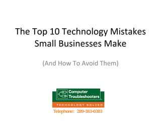 The document outlines 10 common technology mistakes that small businesses make and provides recommendations to avoid them. These mistakes include having weak tech support, using old and inconsistent hardware, inadequate power protection, using illegal software, lacking employee training, weak security practices, insufficient data backups, virus and spyware vulnerabilities, and dealing with spam. It recommends partnering with an IT professional to implement solutions like standardized hardware, software licensing, security updates, data backup policies, malware protection, and email filtering.