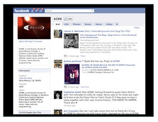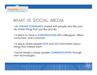 The document discusses the importance of social media for community building and communication. It defines social media as online communities that allow people to connect, converse, and share information about their interests. Examples of major social media platforms are provided like Facebook, Twitter, LinkedIn, and others. The document then outlines a 5 step plan for achieving positive return on investment from social media, including listening to what people say, focusing on relevant audiences, and establishing goals and metrics to track results. It concludes with statistics on Facebook usage and 10 tips for radio stations to leverage social media effectively.