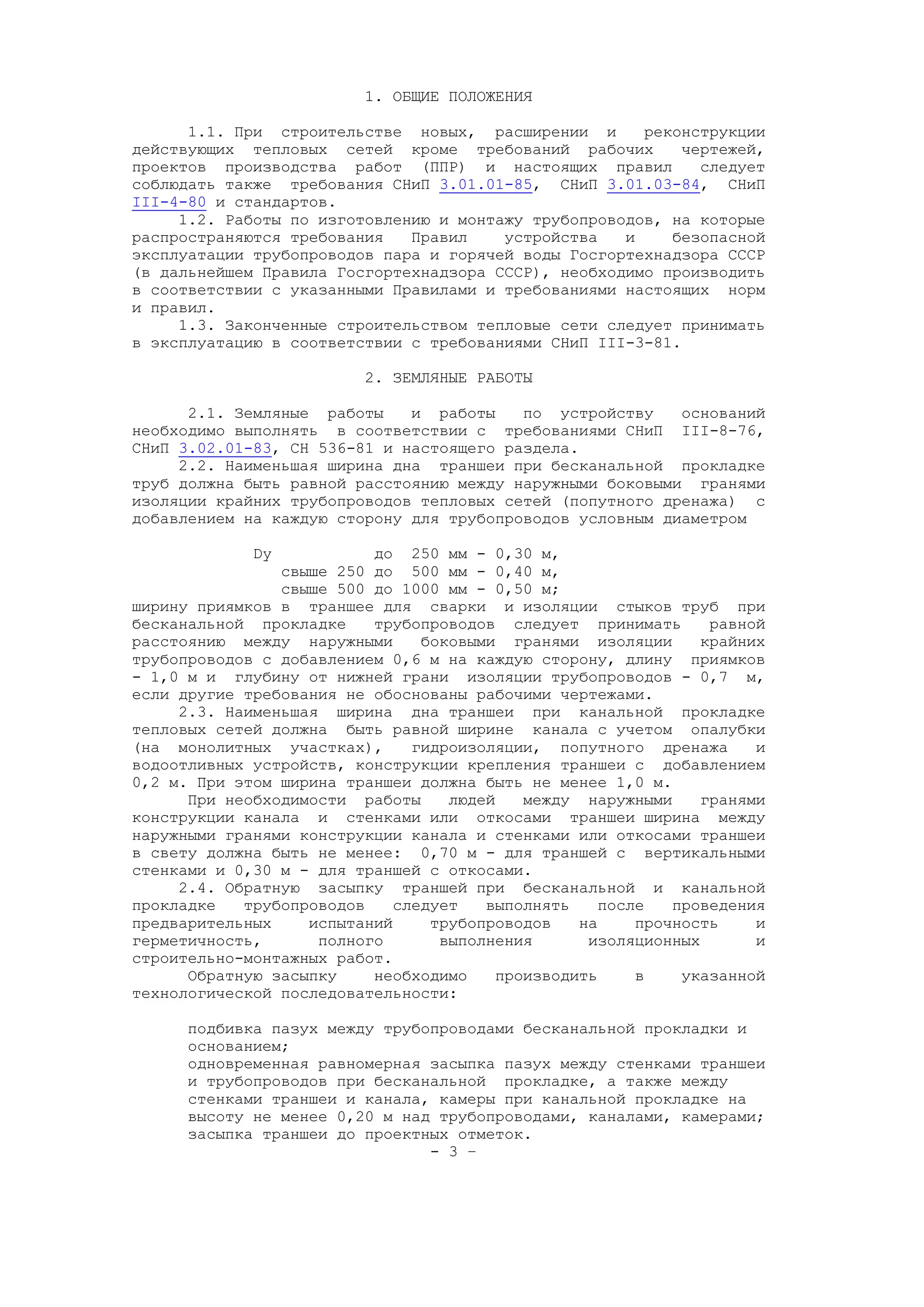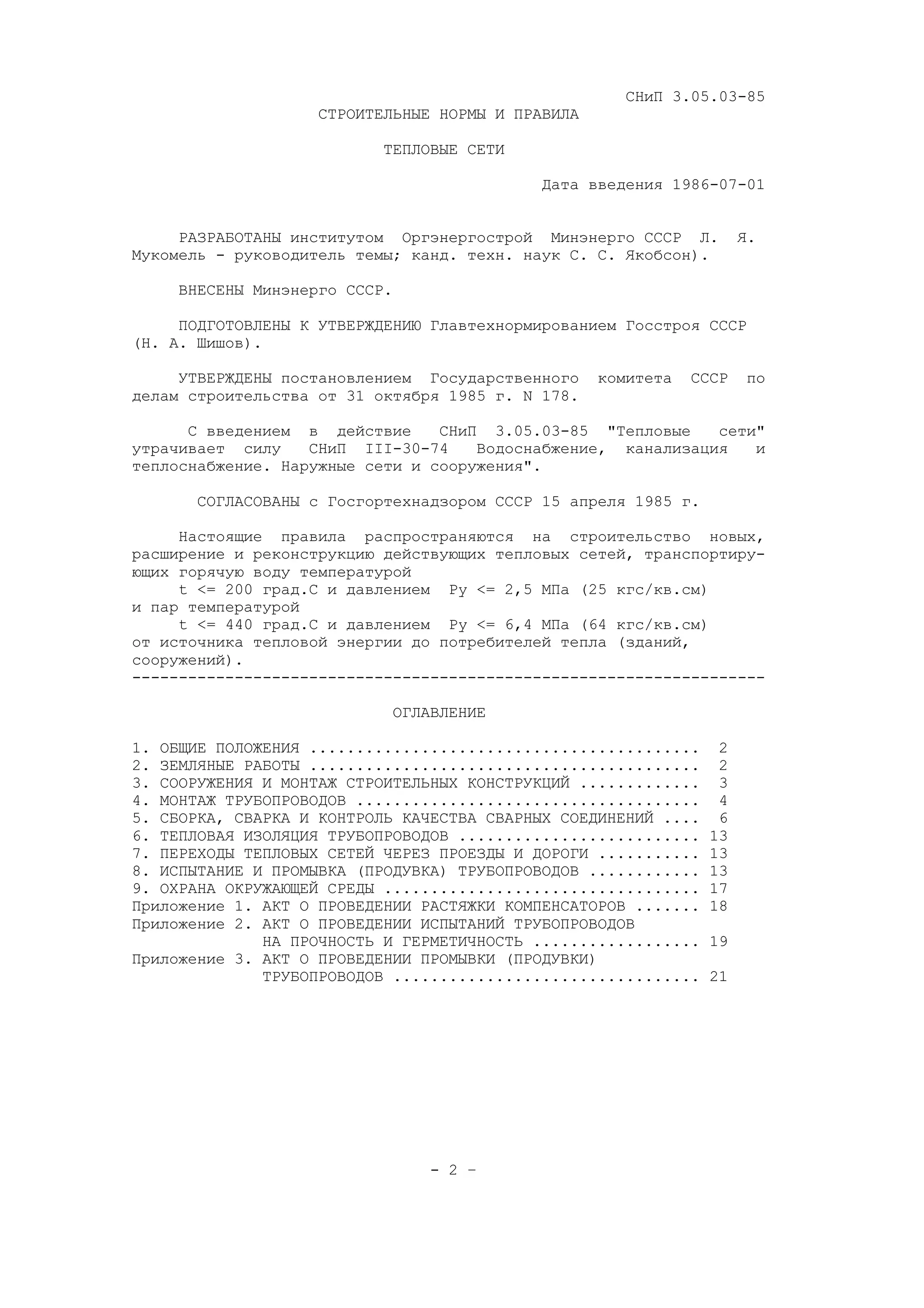 Документ содержит строительные нормы и правила (СНиП 3.05.03-85) для тепловых сетей, действующие с 1 июля 1986 года, которые регулируют проектирование и строительство новых тепловых сетей, а также реконструкцию существующих. Включает требования к земляным работам, монтажу трубопроводов, качеству сварных соединений и тепловой изоляции, а также охране окружающей среды. Основная цель заключается в обеспечении надежности и безопасности эксплуатации тепловых сетей, транспортирующих горячую воду и пар.