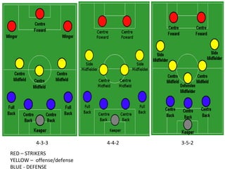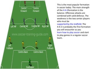 The 4-4-2 formation is the most popular in soccer today with a balance of offense and defense. It features four defenders, four midfielders, and two strikers. The main strength is its balance between attacking and solid defending, though the two center players must be supported by the midfield. It is often the first formation encountered when learning to play soccer on a regular team.