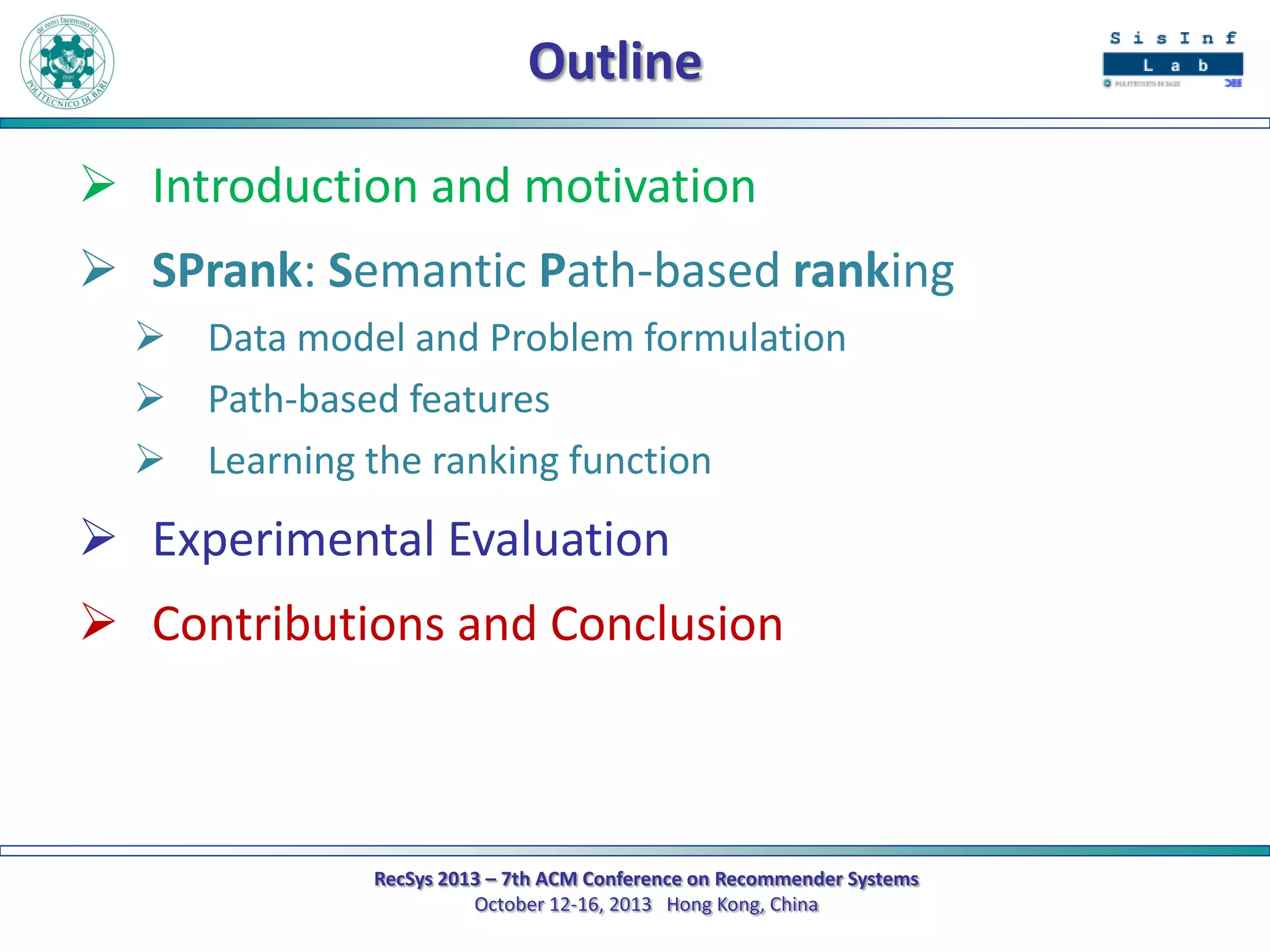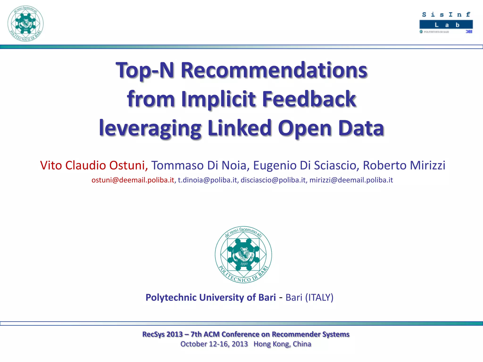 The document describes a new approach called SPrank for top-N recommendations from implicit feedback using linked open data. SPrank analyzes relationships between user preferences and items through path-based features extracted from a knowledge graph. A learning to rank method is used to learn the ranking function from these features. Experimental results on movie and music datasets mapped to DBpedia show SPrank outperforms other recommendation techniques, particularly with smaller user profiles.