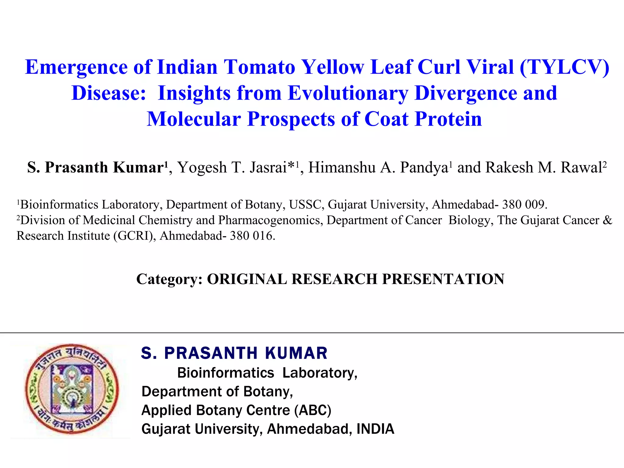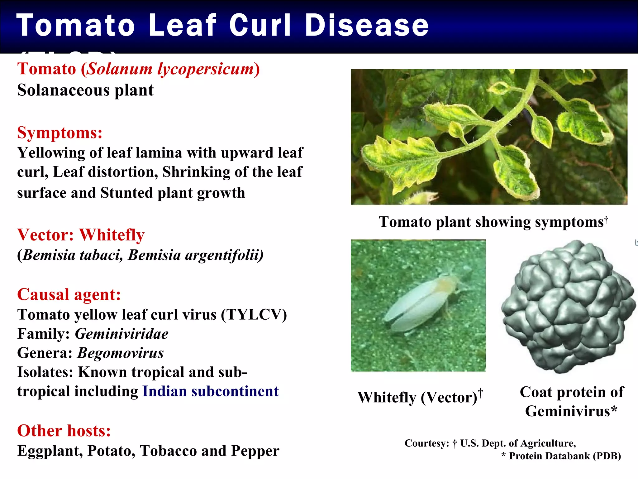 The document summarizes research on the coat protein of the Tomato yellow leaf curl viral (TYLCV) disease, which causes significant damage to tomato crops in India. Key findings include: