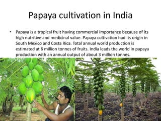 - Papaya is a tropical fruit that is commercially important due to its high nutritional and medicinal value. India is the world's largest producer of papaya, producing around 3 million tonnes annually.