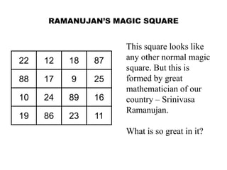 Srinivasa Ramanujan's magic square is notable for its unique properties, where the sum of numbers in every row, column, and diagonal equals 139. Additionally, the sums of identical colored boxes and corner numbers also reach this total. Ramanujan was born on December 22, 1887, highlighting his significance as a prominent mathematician.