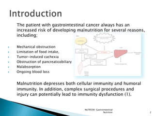 The document reviews evidence on the use of immunonutrition for patients undergoing major upper gastrointestinal cancer surgeries. It summarizes 7 randomized control trials that found immunonutrition containing arginine, omega-3 fatty acids, and nucleotides reduced postoperative infections compared to control solutions. However, studies had flaws like low feeding volumes. More recent research has found benefits of immunonutrition are greater when aggressive enteral feeding protocols are used to provide over 800mL per day. Overall, evidence suggests immunonutrition may decrease infection risk for patients with gastrointestinal cancer undergoing surgery.