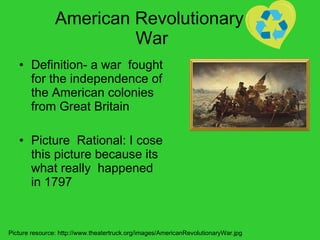 The document is a student's journal entry reviewing key terms from American history and government. It defines and provides a picture for each of the following terms: American Revolutionary War, hemisphere, metropolitan, opinion, ancestor, and customs. For each term, it gives a definition, explains why they chose the accompanying picture, and cites the picture's source on the internet.