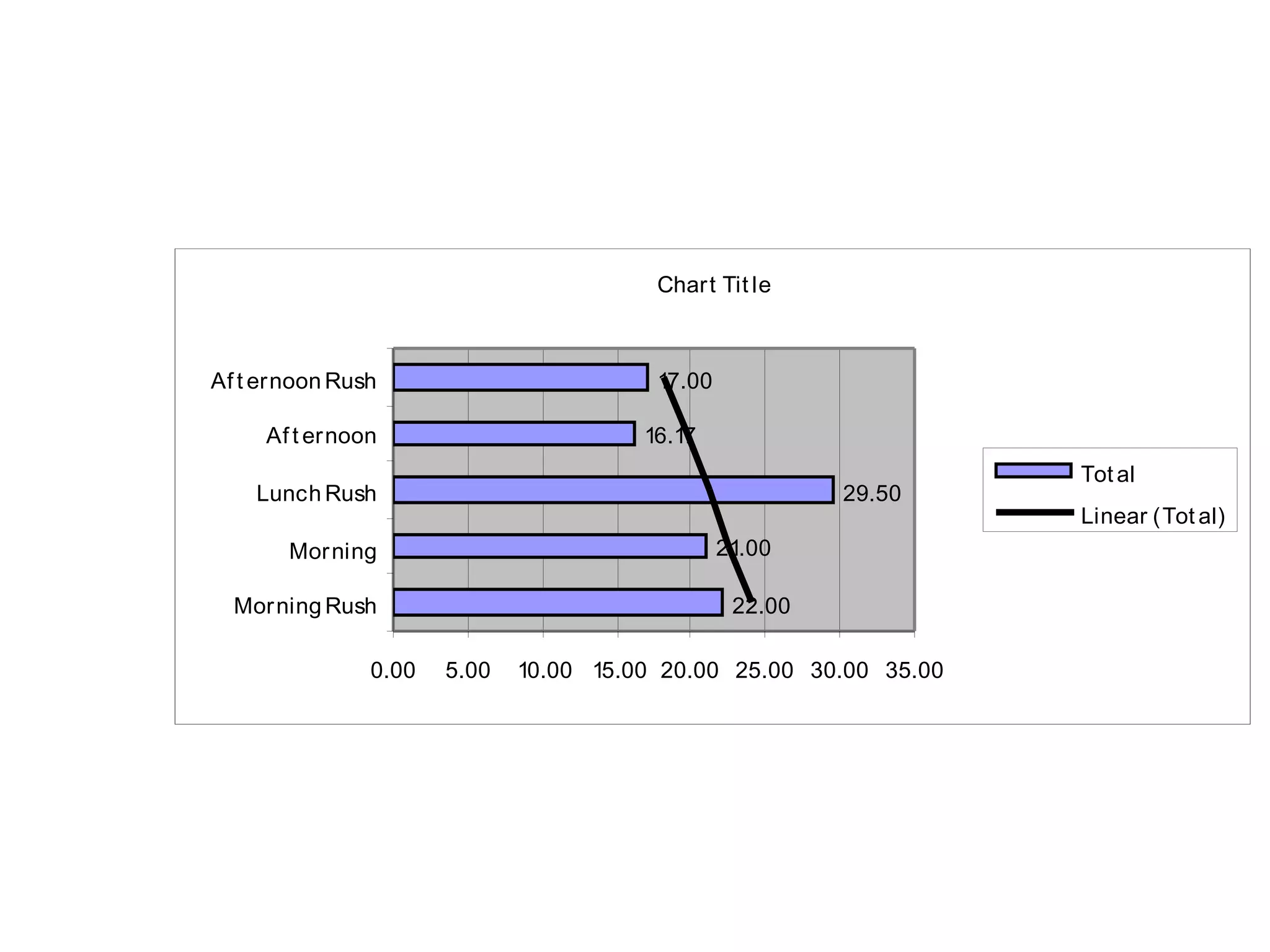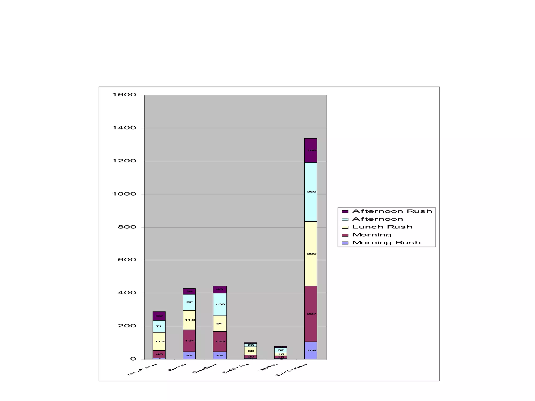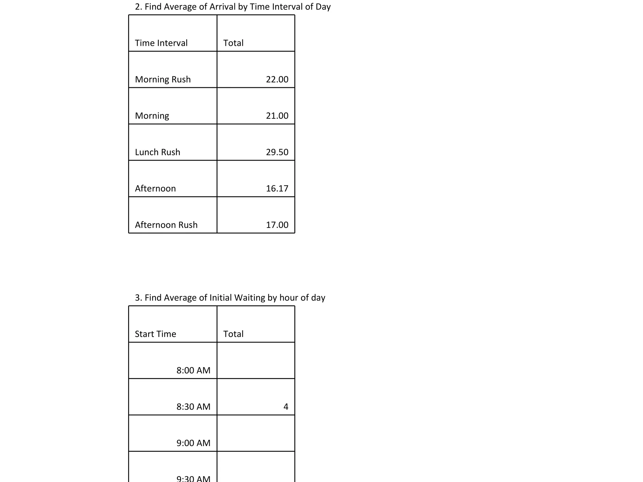 2) Summary statistics calculated from the first table, including the total customers and average initial wait times for morning, lunch and afternoon rush periods. The average arrivals per interval are also calculated.