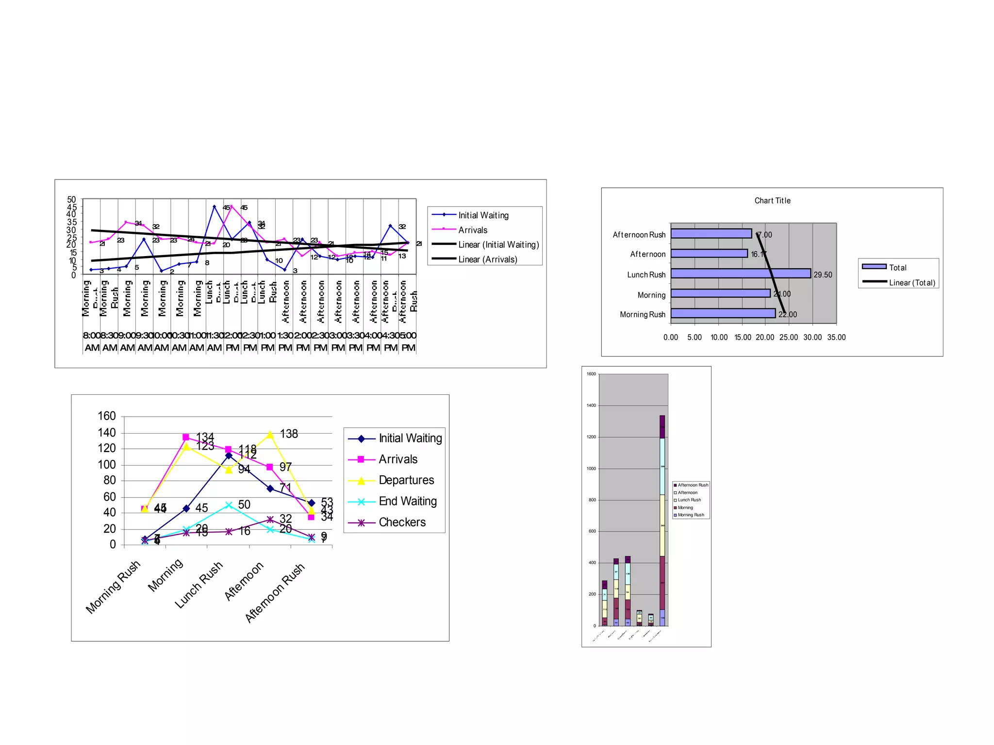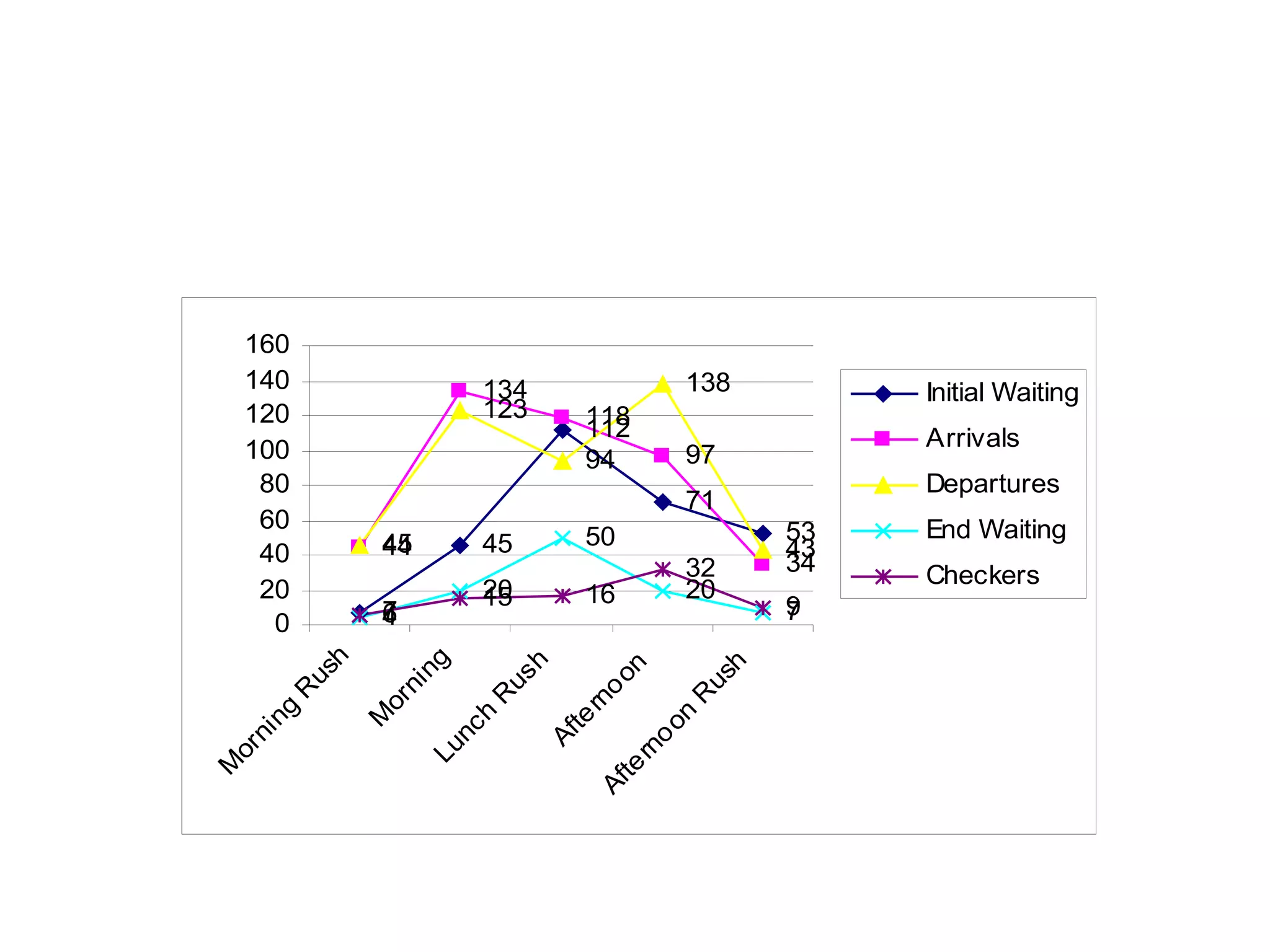 1) Arrival and wait time data broken into half-hour intervals from 8 AM to 5 PM on a Monday. This shows the number of customer arrivals, initial wait times, departures and end wait times for each interval.
