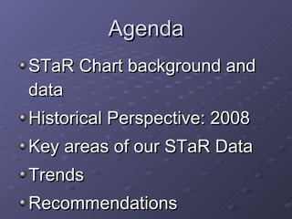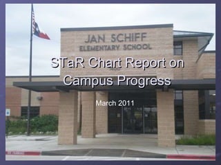 This document summarizes the STaR Chart data for Jan Schiff Elementary from 2008-2009 and 2009-2010. It shows that in 2008-2009, the school was rated as "Developing Tech" in three key areas and "Advanced Tech" in infrastructure. In 2009-2010, the numbers climbed slightly but ratings remained the same. The document recommends increasing teacher accountability for technology integration, providing more technology-based staff development, increasing awareness of instructional support, and maintaining infrastructure progress through fundraising to help the school improve its ratings.