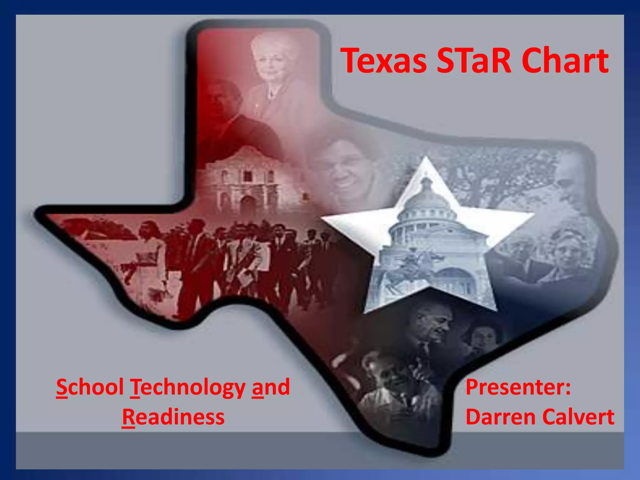 The Texas STaR Chart is a framework that measures how well teachers are prepared to equip students for the 21st century through the integration of technology in teaching and learning. It evaluates four key areas: Teaching and Learning, Educator Preparation and Development, Leadership/Administration/Support, and Infrastructure. The presentation reviews Excel Academy's results in these areas based on its 2008-09 STaR Chart data, identifying its strengths in educator preparation and weaknesses in leadership support. It encourages ongoing technology planning and community input to guide strategic technology integration.