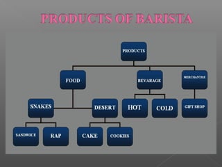 The document discusses the franchise business of Barista Lavazza, an Italian coffee brand established in 1895 and brought to Bangladesh in 2008. It highlights the company's history, employee management, marketing strategies, and recent achievements including being awarded Super Brand status. Recommendations for Barista include expanding the menu, increasing branch locations, enhancing advertising efforts, and improving service quality through skilled employees.