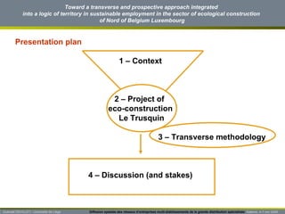 The document discusses a project in northern Belgium and Luxembourg to promote sustainable employment in the ecological construction sector. It describes a transverse methodology involving stakeholders from social inclusion and economic development. The project aims to create synergies between actors and encourage skills development. A specific project involves the eco-renovation of a building by an employment training enterprise collaborating with other partners. Challenges and conditions for success are also outlined.