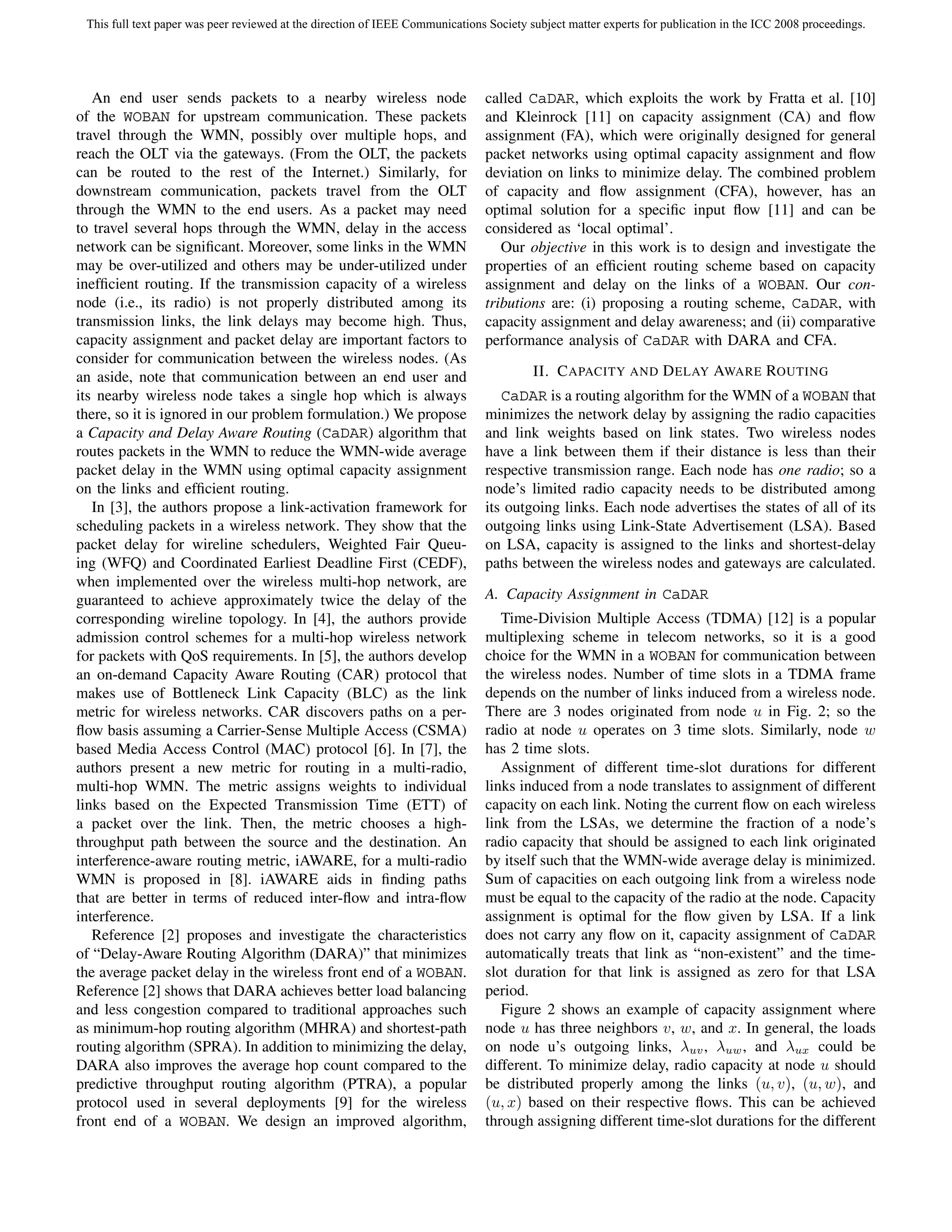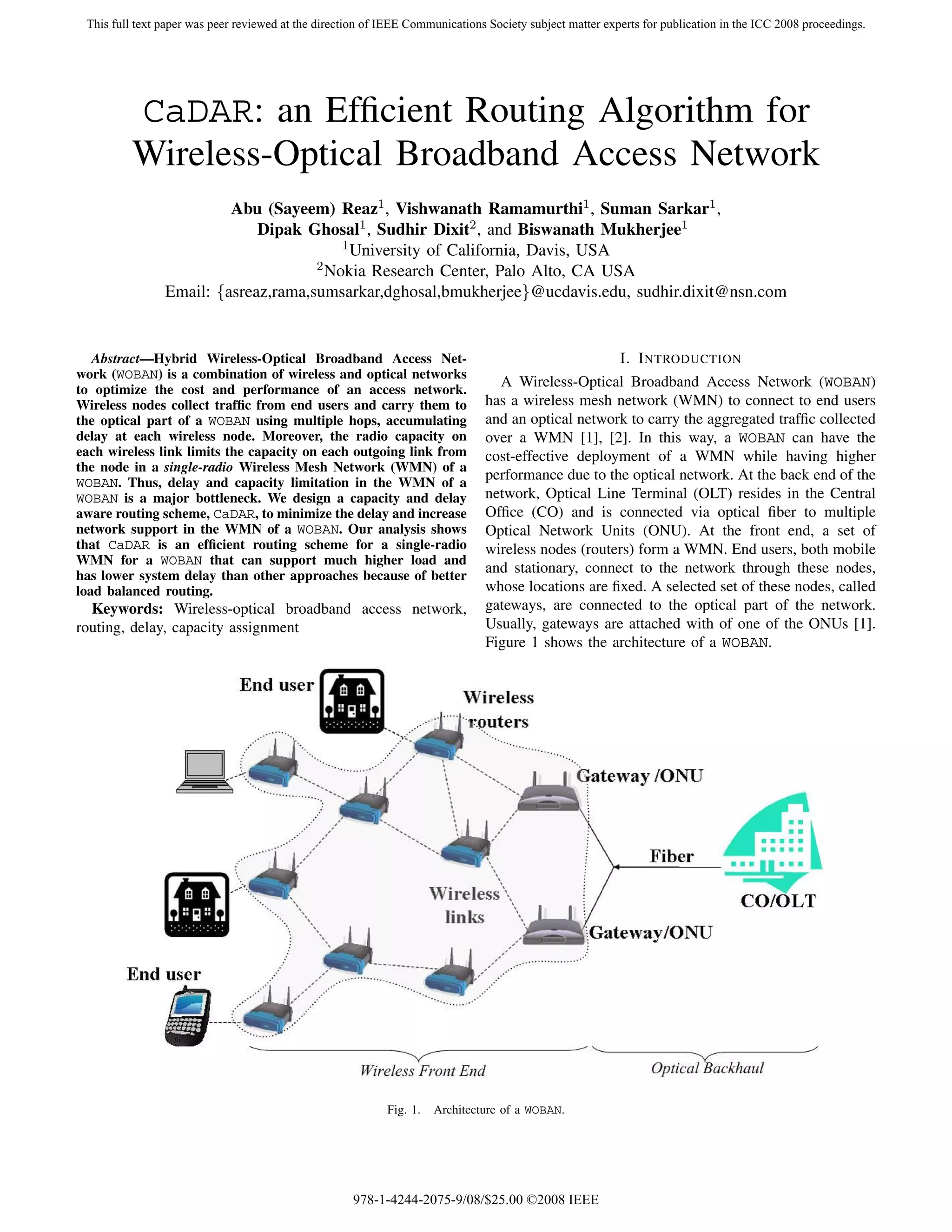 This document is a peer-reviewed full-text paper published in the proceedings of ICC 2008 that proposes an efficient routing algorithm called CaDAR for wireless-optical broadband access networks (WOBANs). CaDAR aims to minimize delay and increase capacity in the wireless mesh network portion of a WOBAN by assigning capacities to links based on their states and calculating shortest delay paths between wireless nodes and gateways. The paper contributes by proposing the CaDAR algorithm and providing a comparative performance analysis of CaDAR with other approaches.