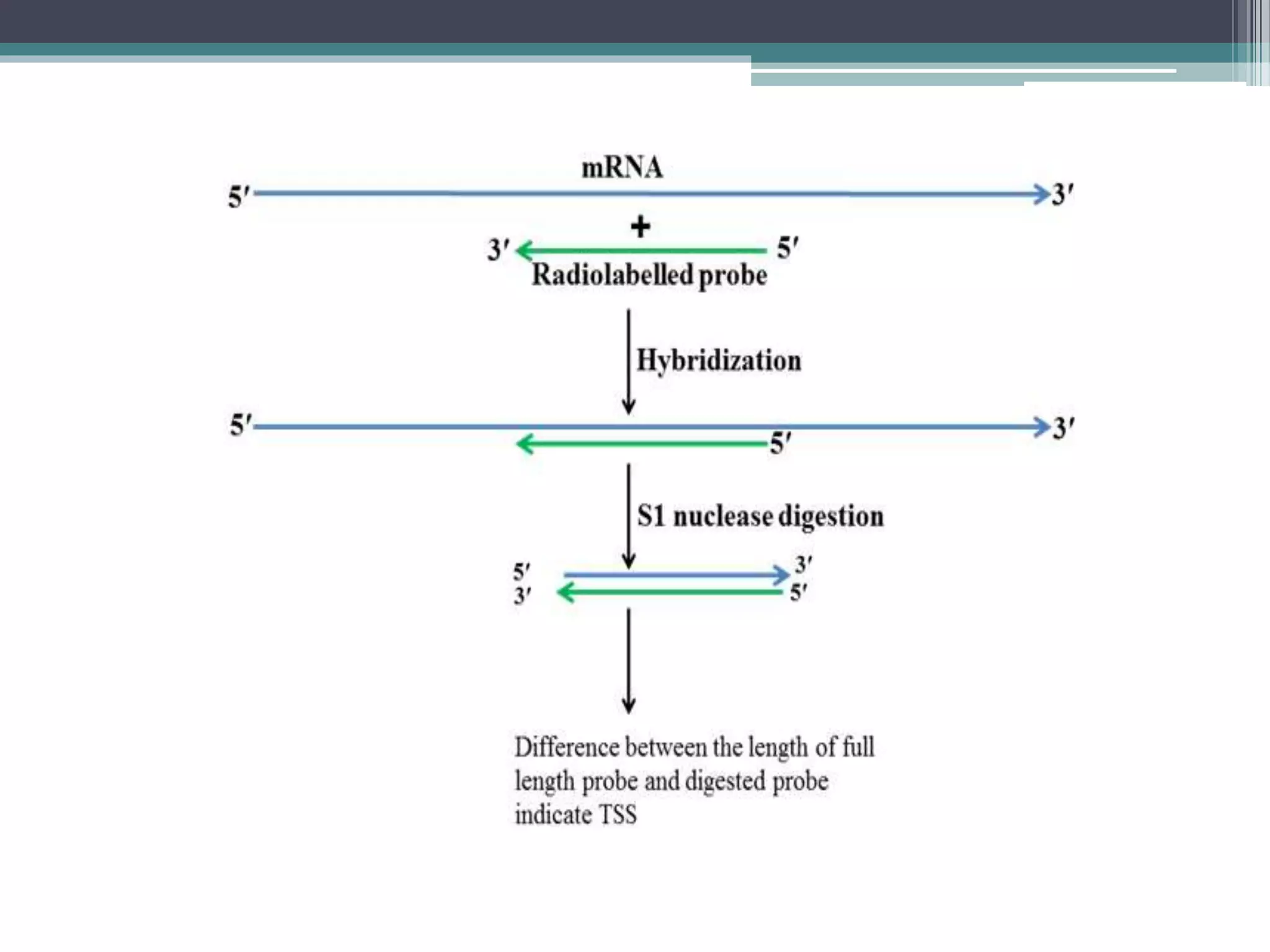 S1 nuclease mapping is a laboratory technique used to locate the 5' end of an RNA transcript within a mixture by using the S1 nuclease. The S1 nuclease is an endonuclease that degrades single-stranded DNA and RNA but does not degrade double-stranded DNA or RNA-DNA hybrids. In S1 mapping, a transcript is hybridized to a DNA template and treated with S1 nuclease, which degrades any unhybridized RNA. This allows mapping the 5' end of the transcript to the DNA template. S1 nuclease mapping can determine the exact locations of start and end points of transcription and any splice points within transcripts.