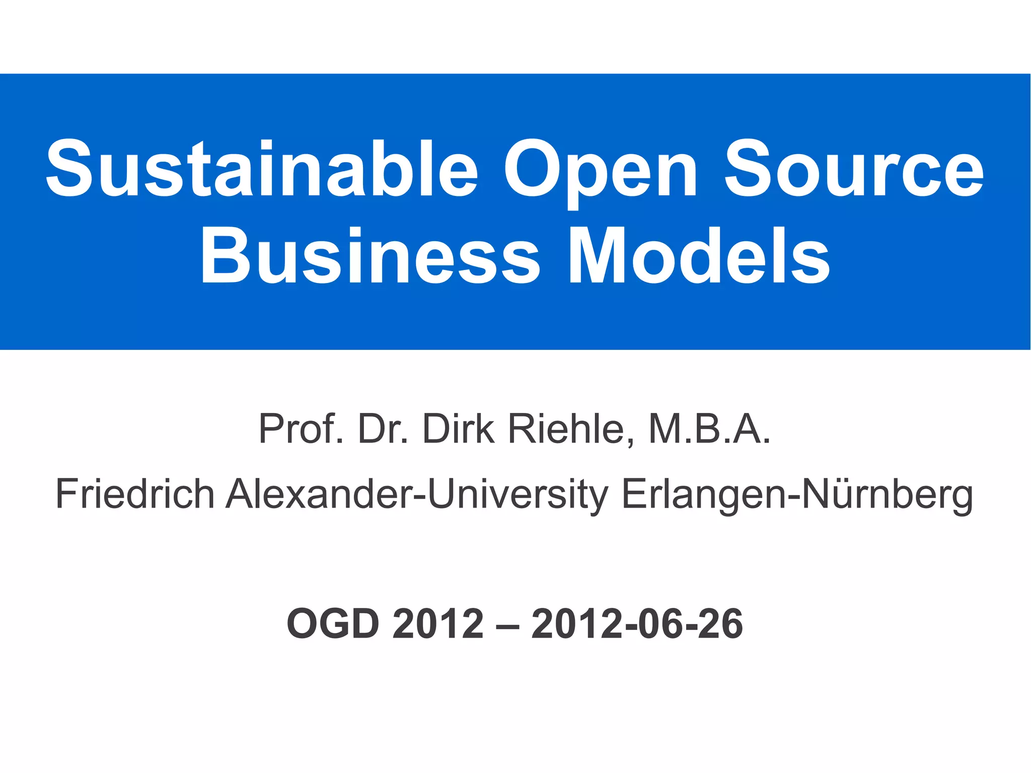 The document discusses sustainable open source business models. It outlines four models: 1) single-vendor open source firms that derive revenue directly from open source software, 2) open source distributors that provide commercial support for open source, 3) developer foundations that manage open source development to lower costs for members, and 4) user foundations that finance open source development to reduce costs. The document argues that open source simplifies consortia by allowing collaboration between vendors, users, developers and other groups.