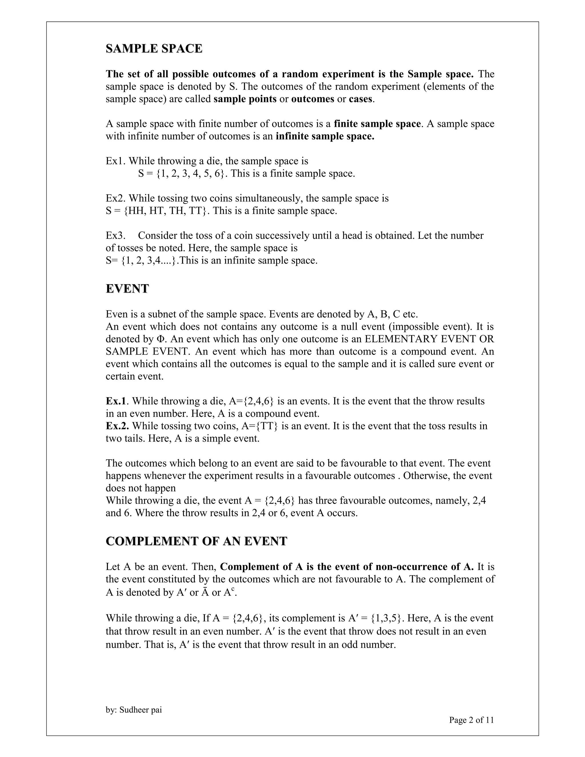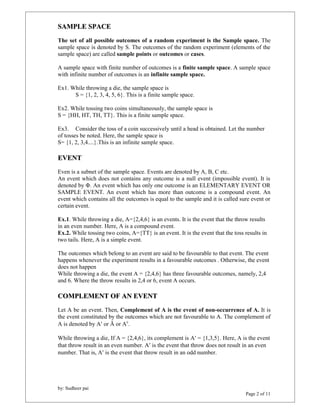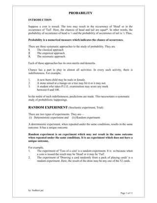 This document provides an introduction to probability and some key probability concepts. It discusses how probability can be used to measure the chance of outcomes in random experiments and defines key terms like sample space, events, equally likely events, unions and intersections of events. It also presents the classical approach to defining probability mathematically as the ratio of favorable outcomes to total possible outcomes when conditions like equally likely outcomes are met. Several examples are provided to illustrate probability calculations.