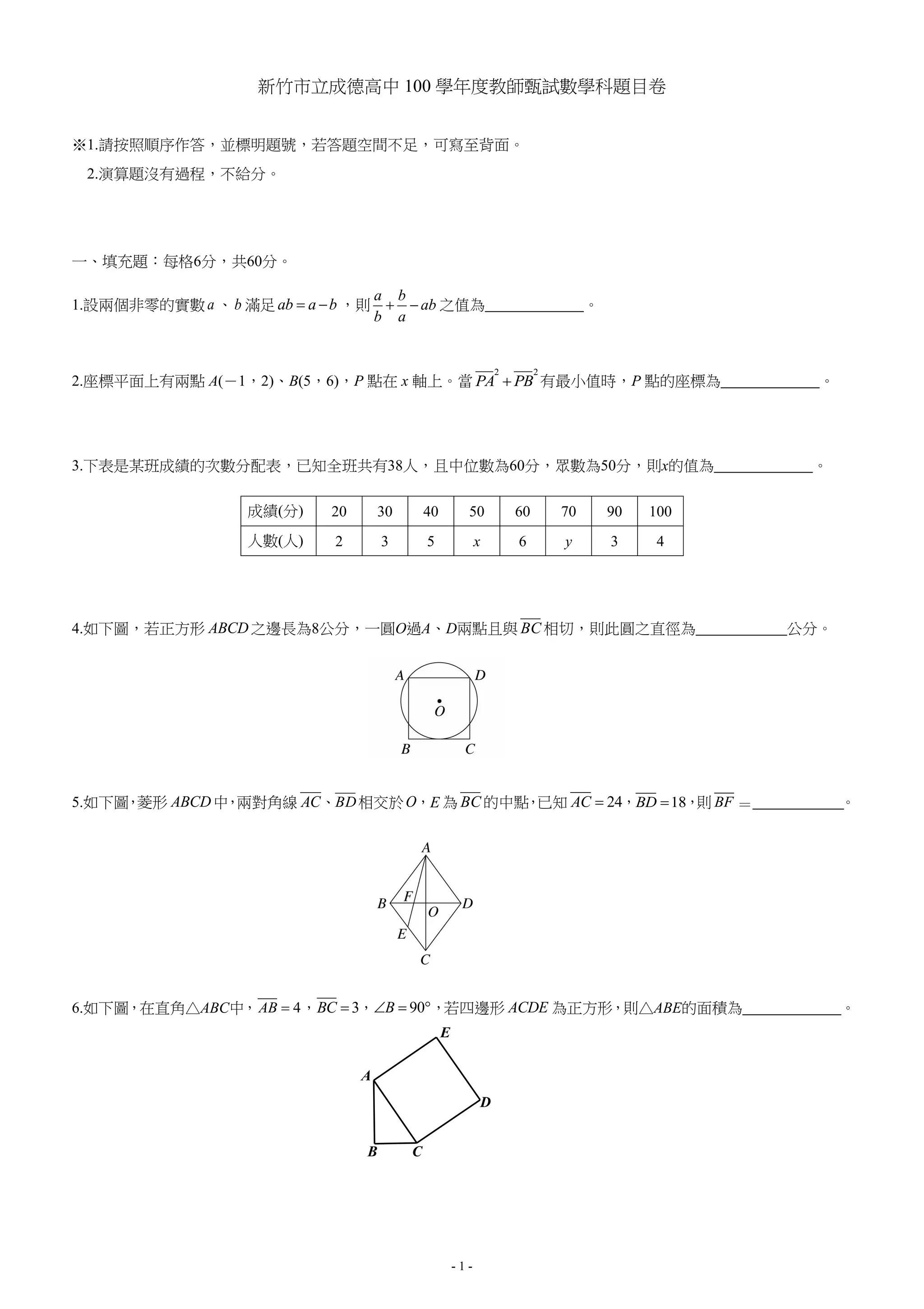 该文档为新竹市立成德高中100学年度教师甄试数学科题目卷,包含填充题和演算题,涉及代数、几何和统计等数学知识。填充题共10题,每题6分;演算题共4题,每题10分,共计100分。题目设计旨在测试学生对数学概念和问题解决能力的掌握。