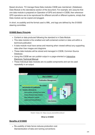 S1000D is a European technical documentation standard used in aerospace and defense industries since 1980. It uses a common source database (CSDB) to store and manage reusable data modules that can be compiled to generate technical manuals. The benefits of S1000D include reduced costs from reusable data, standardized naming conventions, open format, and the ability to generate customized outputs from a single data source. Major users include the military, aviation, and space industries. Code and Pixels is an experienced developer of S1000D technical documentation.