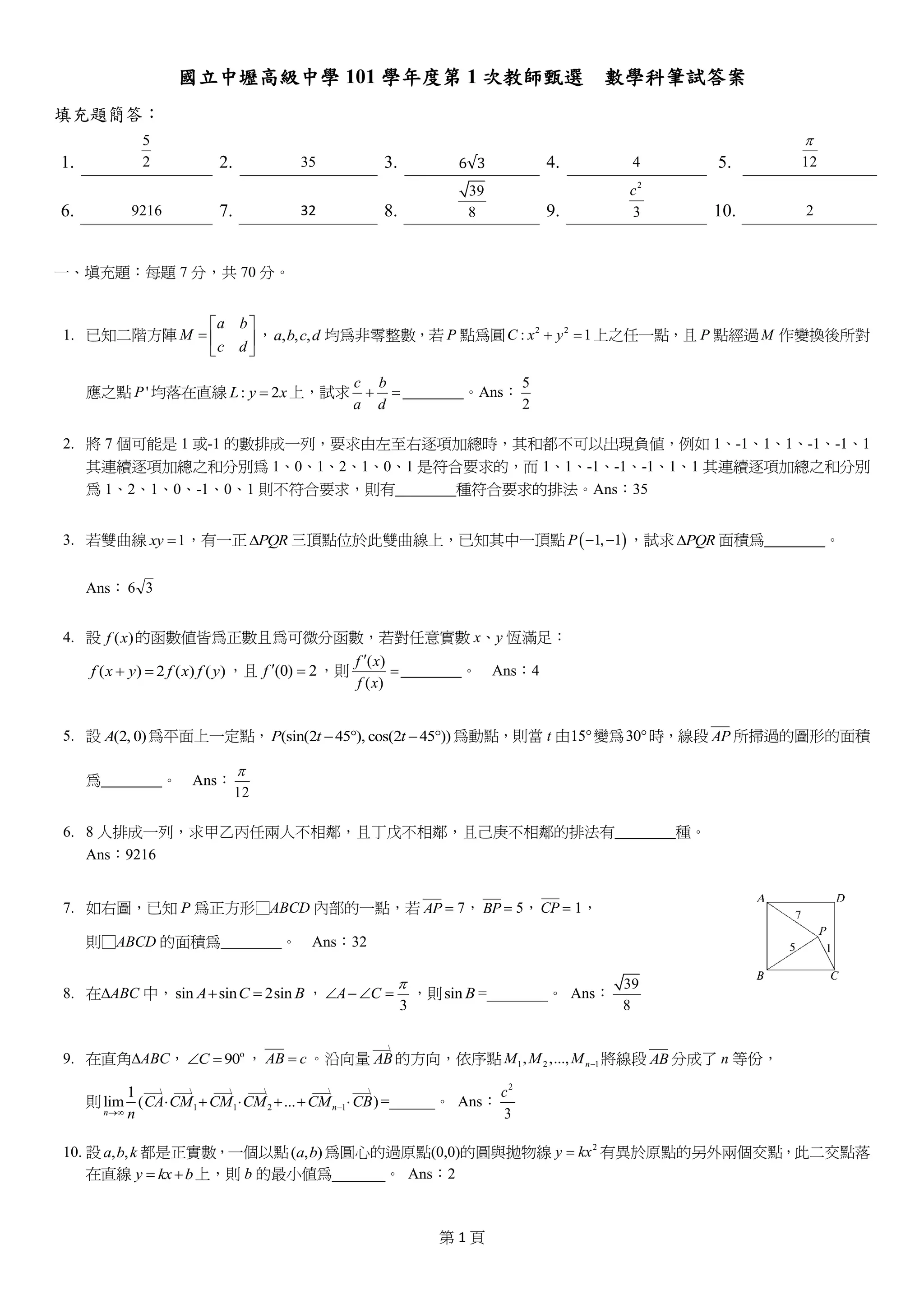 101 學年度第 1 次教師甄選 數學科筆試答案 填充題簡答: 1. 2 5 2. 35 3. 6√3 4. 4 5. 12 6. 9216 7. 32 8. 39 8 9. 2 3 c 10. 2 一、填充題:每題 7 分,共 70 分。 1. 已知二階方陣 a b M c d , , , ,a b c d 均為非零整數,若 P 點為圓 2 2 : 1C x y 上之任一點,且 P 點經過 M 作變換後所對 應之點 'P 均落在直線 : 2L y x 上,試求 d b a c 。Ans: 2 5 2. 將 7 個可能是 1 或-1 的數排成一列,要求由左至右逐項加總時,其和都不可以出現負值,例如 1、-1、1、1、-1、-1、1 其連續逐項加總之和分別為 1、0、1、2、1、0、1 是符合要求的,而 1、1、-1、-1、-1、1、1 其連續逐項加總之和分別 為 1、2、1、0、-1、0、1 則不符合要求,則有 種符合要求的排法。Ans:35 3. 若雙曲線 1xy ,有一正 PQR 三頂點位於此雙曲線上,已知其中一頂點 1, 1P ,試求 PQR 面積為 。 Ans: 36 4. 設 )(xf 的函數值皆為正數且為可微分函數,若對任意實數 x、y 恆滿足: )()(2)( yfxfyxf ,且 2)0( f ,則 )( )( xf xf 。 Ans:4 5. 設 (2, 0)A 為平面上一定點, (sin(2 45 ), cos(2 45 ))P t t 為動點,則當 t 由15變為30時,線段 AP 所掃過的圖形的面積 為 。 Ans: 12 6. 8 人排成一列,求甲乙丙任兩人不相鄰,且丁戊不相鄰,且己庚不相鄰的排法有 種。 Ans:9216 7. 如右圖,已知 P 為正方形□ABCD 內部的一點,若 AP 7, BP 5,CP 1, 則□ABCD 的面積為 。 Ans:32 8. 在ABC 中,sin sin 2sinA C B , 3 A C ,則sin B =________。 Ans: 39 8 9. 在直角ABC, o 90C , AB c 。沿向量 ____ AB 的方向,依序點 1 2 1, ,..., nM M M 將線段 AB 分成了 n 等份, 則 ________ ____ ____ ____ ____ 1 1 2 1 1 lim ( ... )n n CA CM CM CM CM CB n =______。 Ans: 2 3 c 10. 設 , ,a b k 都是正實數,一個以點( , )a b 為圓心的過原點(0,0)的圓與拋物線 2 y kx 有異於原點的另外兩個交點,此二交點落 在直線 y kx b 上,則 b 的最小值為_______。 Ans:2