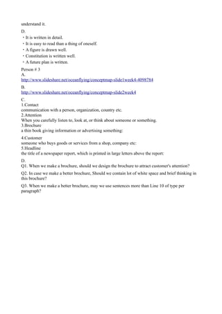 The document discusses effective brochure design. It provides tips for creating brochures that are easy to understand and will attract and maintain customers' attention. Specifically, it recommends using simple language without complex ideas, including visuals, emphasizing key points, and checking for errors. The goal is to design brochures that clearly communicate intended messages to readers.