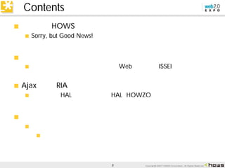 该文档包含关于Hows公司的一些信息,提到了一些技术细节和联系方式。文档内容涉及AJAX和Web2.0技术,可能包括一系列更新和公告。整体上,文档呈现了公司在特定日期的通讯和发展动态。