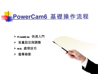 本文件介紹了 powercam 的基礎操作流程,包括音量設定、螢幕錄影及資料上傳等技巧。它提供清晰的教材資訊和設計建議,幫助使用者製作精彩的教學內容。在應用範本中,強調了業務應用、教育訓練及專業技術解說的流程。