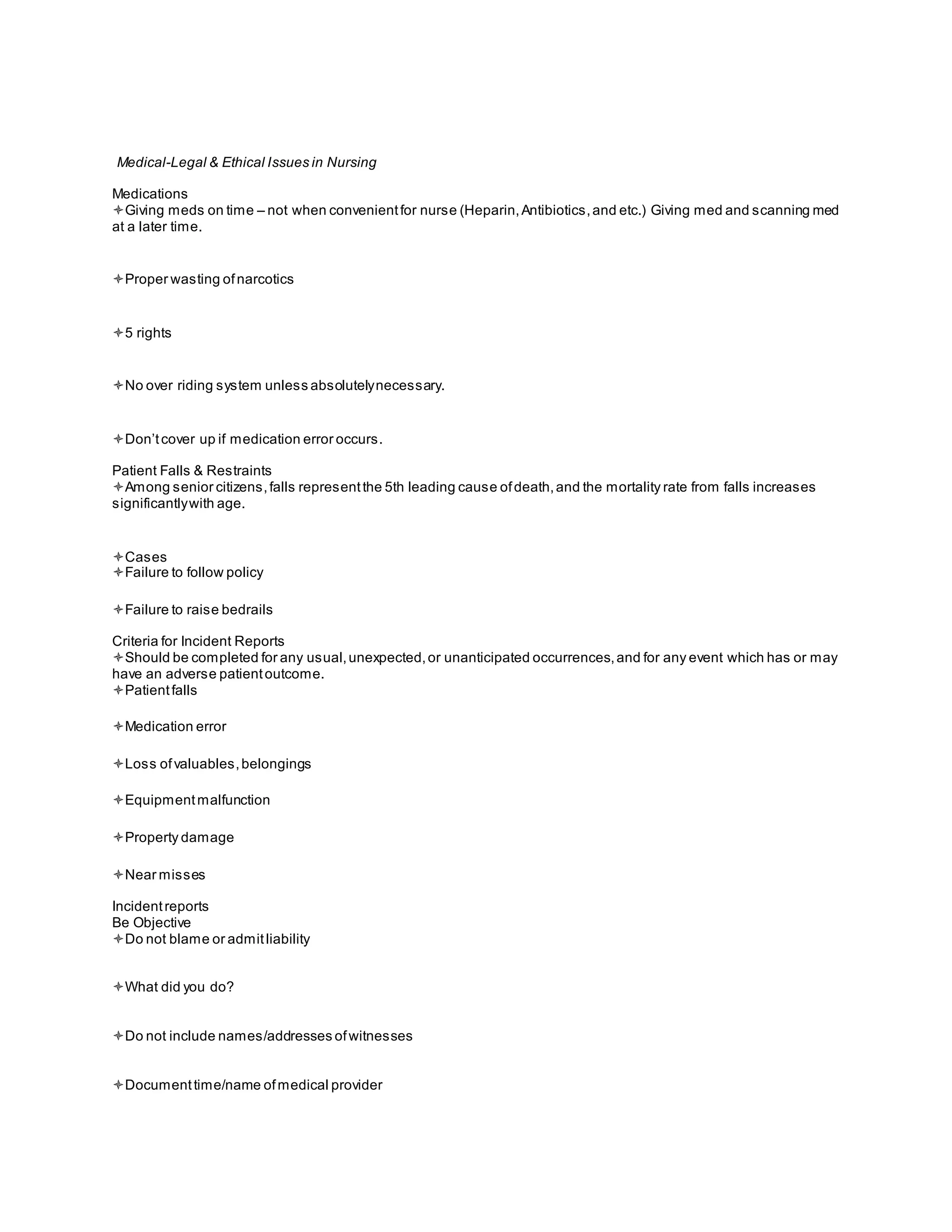 This document discusses several medical-legal and ethical issues in nursing including proper medication administration, patient falls, documentation requirements, handoff communication, abandonment, and negligence. It emphasizes giving medications on time, proper wasting of narcotics, following the 5 rights, and not covering up medication errors. It outlines criteria for incident reports, requirements for objective and complete documentation, and stresses avoiding blaming, omitting details, or leaving the record incomplete. Malpractice, the nurse's duty to the patient, and grounds for license suspension are also addressed.