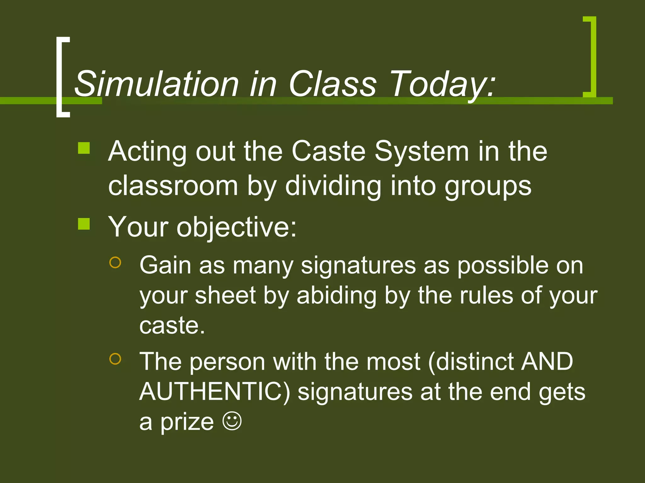 The document outlines a classroom simulation of the Indian caste system. Students will be divided into groups representing different castes - Brahmans, Vaisyas, Sudras, and Untouchables. Each caste has different social rules to follow, with Brahmans at the top and Untouchables at the bottom. The objective is to get signatures from other castes on a sheet, but castes cannot speak to or touch those below their status without consequences. The student with the most authentic signatures at the end wins a prize.